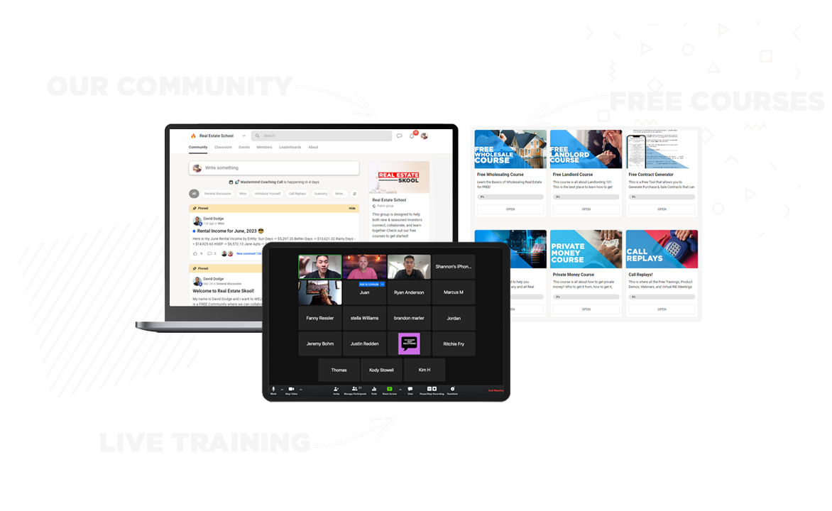 Real Estate Skool is our exclusive community where investors connect, learn, and grow together. You’ll get access to group coaching, weekly calls, and networking with like-minded investors.