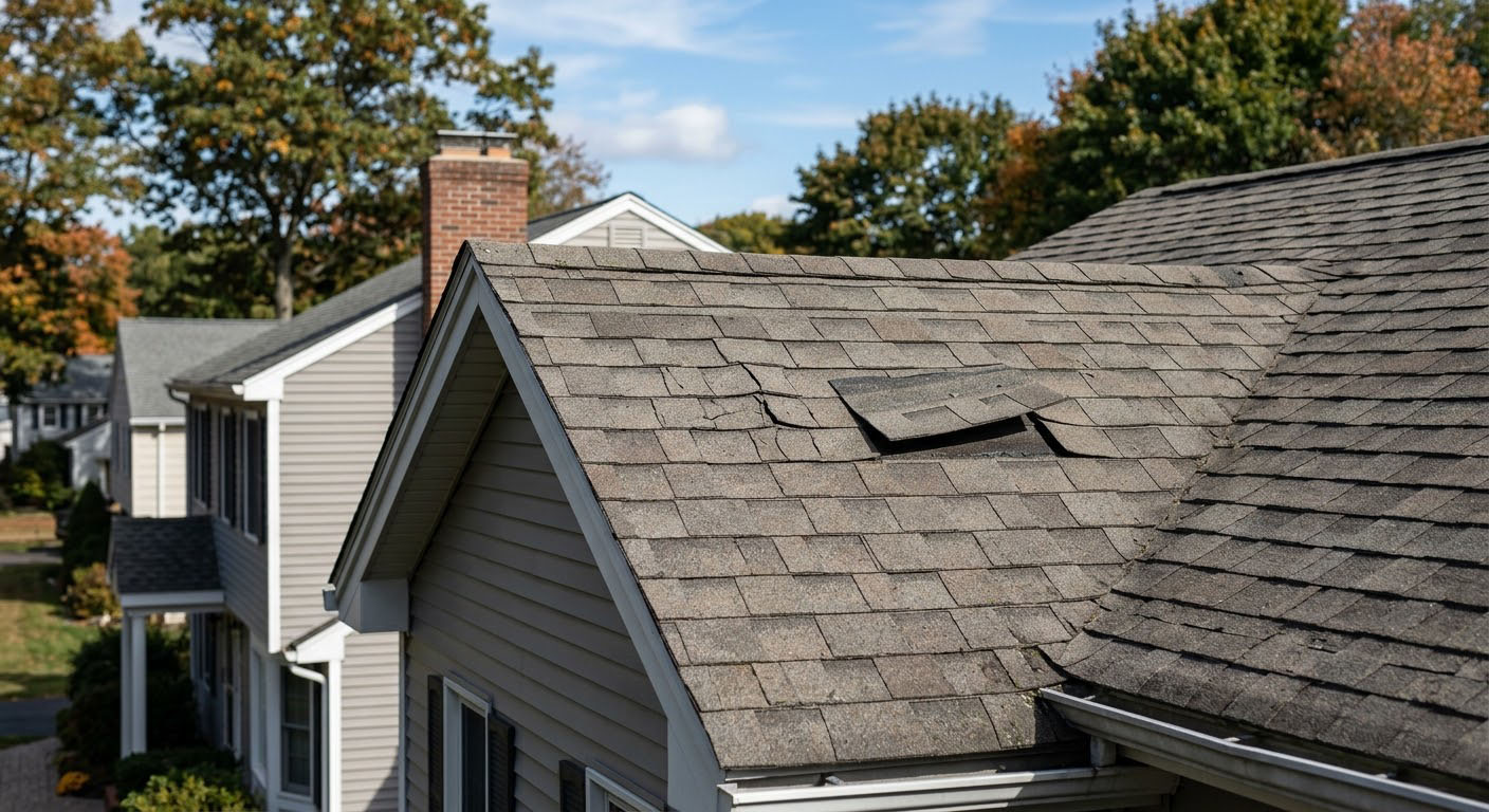 You don't need to get up on the roof yourself — in fact, please don't. But you can get a lot of information just by standing in the yard and looking. Missing shingles, shingles that are curling at the edges, or patches where the shingles look significantly different from the rest of the roof are all warning signs.