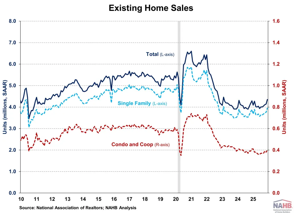 According to the National Association of REALTORS® (NAR), U.S. existing-home sales rose 5.1% month over month in December 2025, reaching a seasonally adjusted annual rate of approximately 4.35 million homes sold. This marked the strongest monthly increase in nearly three years, occurring during one of the slowest seasonal periods for housing activity.