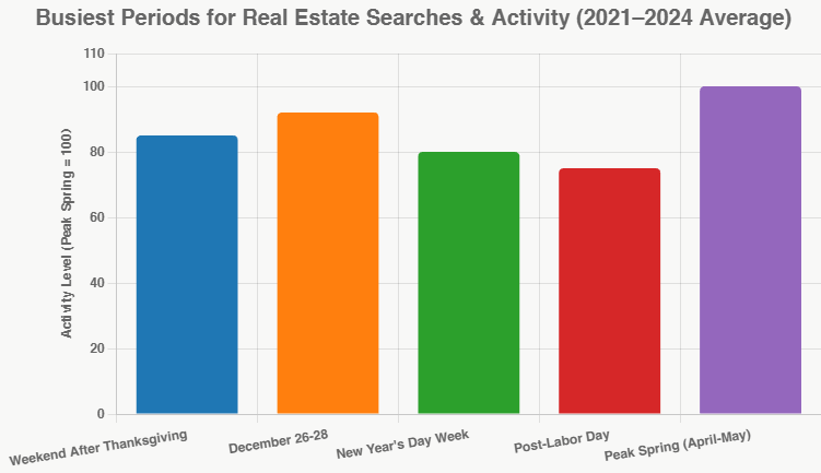 Historical reports show December 28 ranking among the busiest days for searches, while post-Christmas Sundays are top days for agent activity..